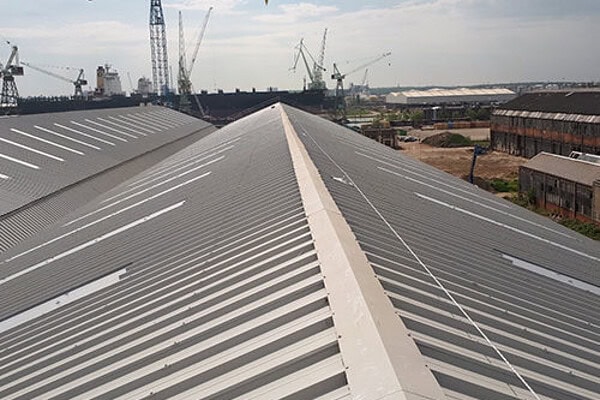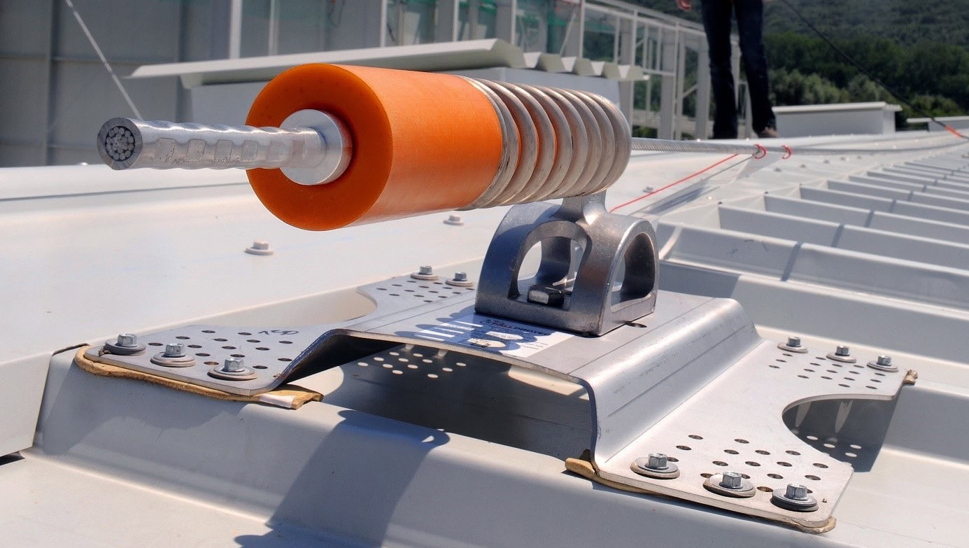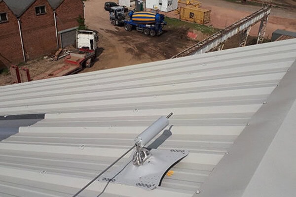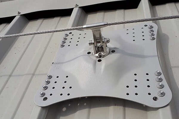 Op een stalen dak worden inox steunplaten aangebracht die met een zeker aantal zelfborende vijzen worden vastgezet. Hierop vertrekken we dan met de nodige componenten voor de levenslijn. Deze componenten zijn meestal universeel in gebruik.